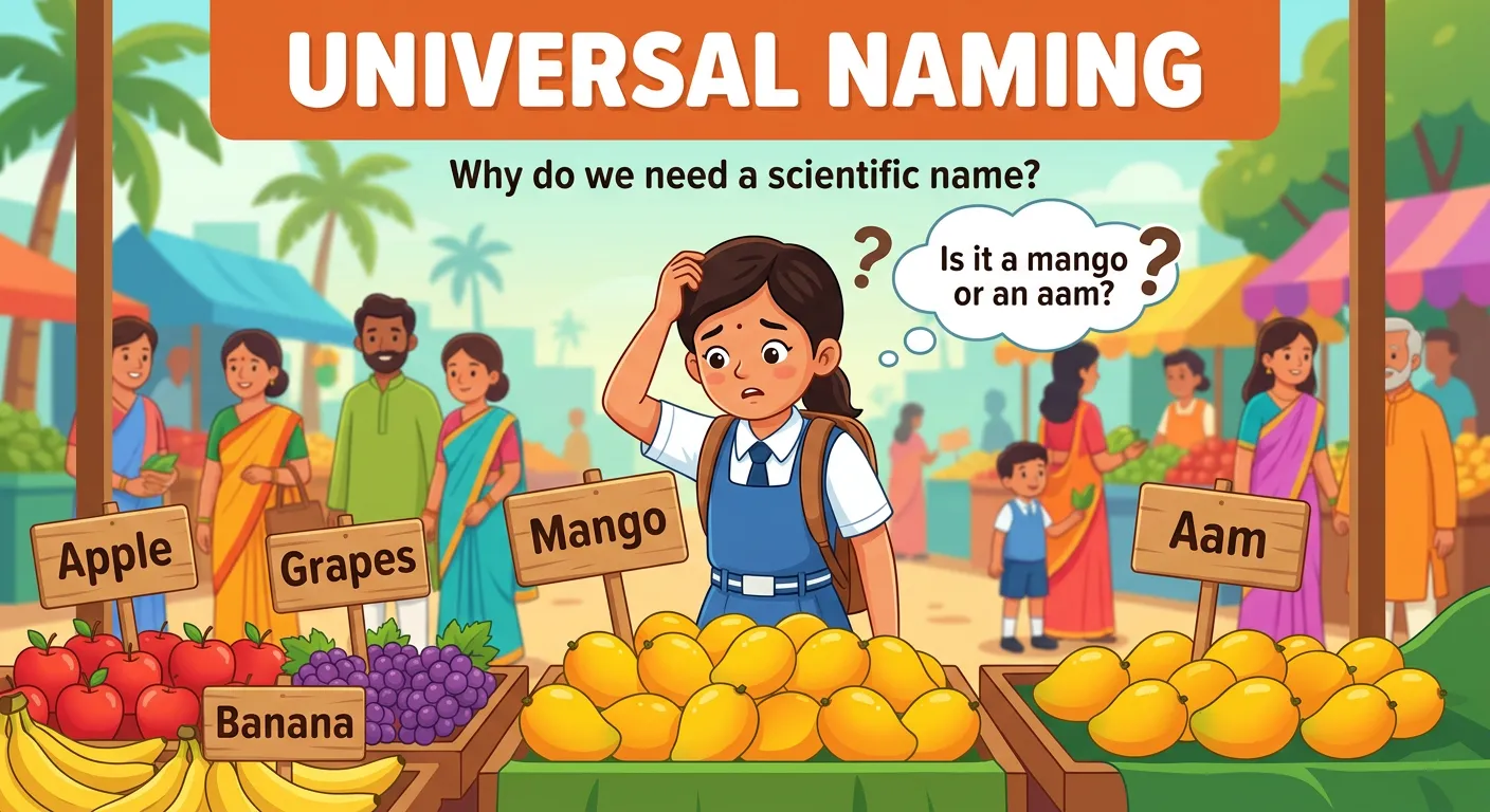 Welcome, future doctors! Imagine going to a market where a fruit is called 'Aam' here, but 'Mango' elsewhere. Confusion, right? To solve this, scientists created Binomial Nomenclature—a universal system to name organisms, ensuring that one organism has exactly one scientific name recognized across the entire world.