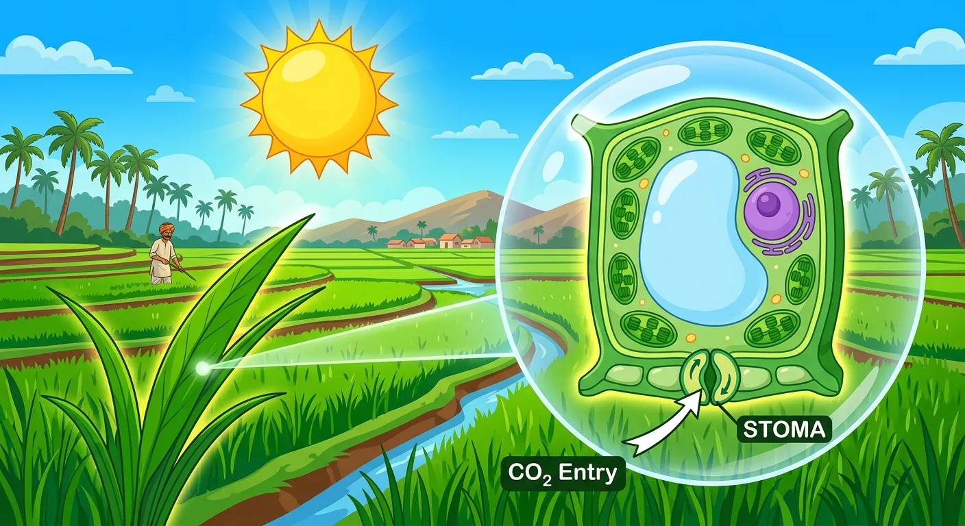 Welcome, future doctors! Imagine a leaf as a tiny, solar-powered factory. In the C3 pathway, plants like rice and wheat grab carbon dioxide directly from the air through their stomata. It’s like the raw material entering the factory gates to start the production of food!