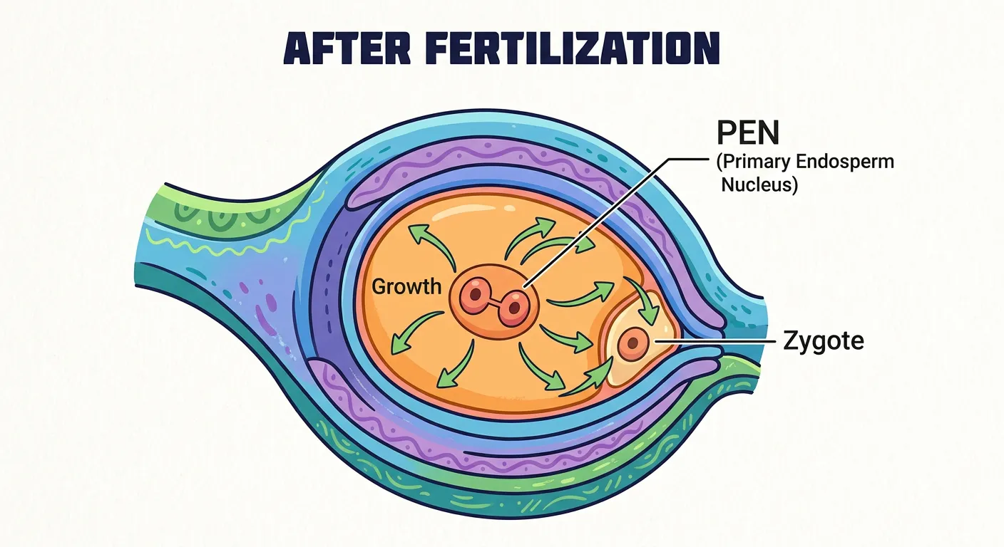Namaste NEET aspirants! After the grand event of double fertilization, the story shifts. Inside the ovule, we now have two main VIPs: the triploid Primary Endosperm Nucleus, or PEN, and the diploid Zygote. It's time for their growth story to begin!