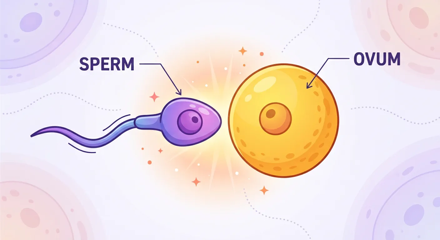 Hello future doctors! Imagine fertilization as the ultimate 'Sangam' or grand meeting. It's when a small sperm from the father and a large ovum from the mother come together. This 'Milan' marks the very beginning of a new life!