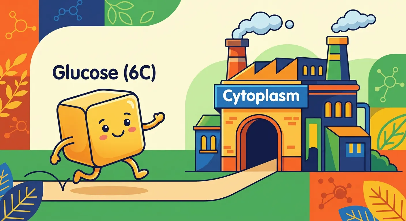 Welcome, NEET warriors! Imagine glycolysis as the 'opening act' of cellular respiration. It takes place in the cytoplasm, outside the mitochondria. Our star player, a 6-carbon glucose molecule, enters the factory floor, ready to be broken down into energy. Let's see how this metabolic journey begins!