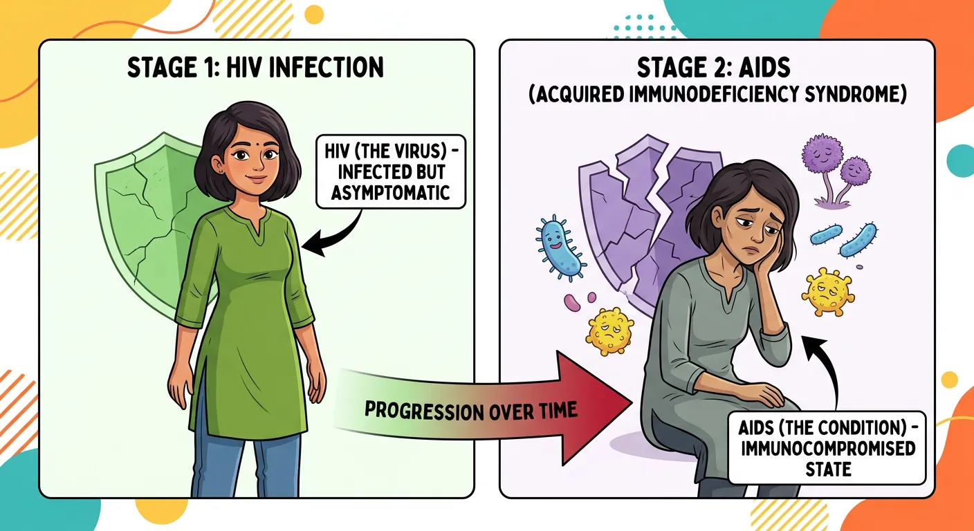 Hello students! Welcome to this session on HIV and AIDS. First, let's clear up a major confusion: HIV is the virus itself, and AIDS is the advanced stage of the disease. While HIV infection is the starting point, AIDS only occurs when the immune system is severely compromised over time. Think of it as a small spark that could potentially lead to a forest fire if not controlled.