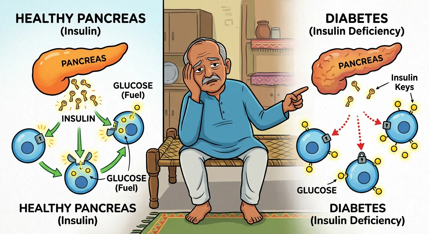 Hello, future doctors! Imagine Dadaji has Diabetes. His body either can't make or use 'Insulin' – the key that lets fuel (glucose) into his 'kitchen' (cells). Without insulin, glucose builds up in his blood, making him feel very weak.