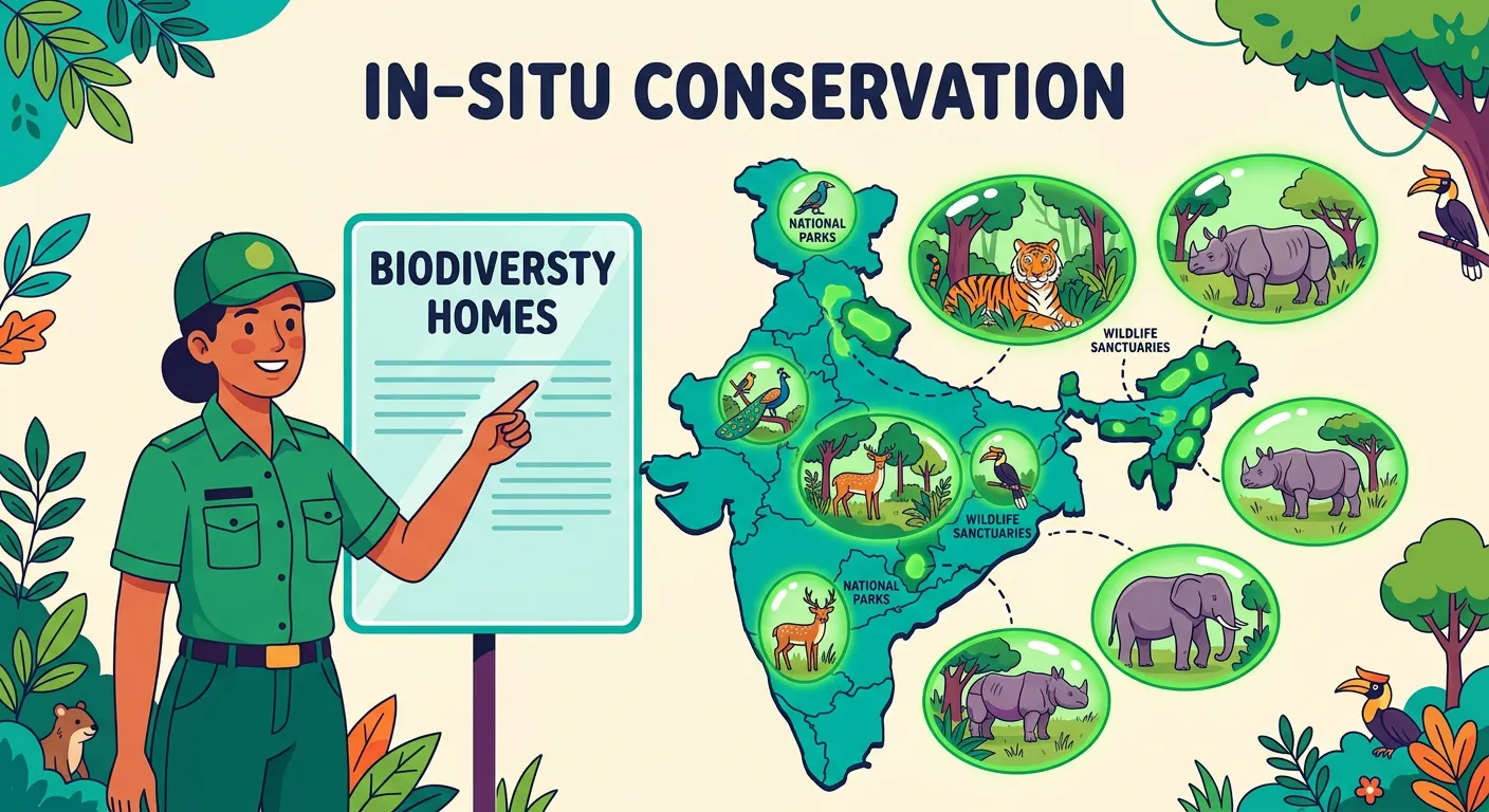 Welcome, future doctors! Imagine your house is your safest place. Biodiversity also needs safe homes, away from threats like poaching. This is where National Parks and Sanctuaries come in. They are 'In-Situ' conservation spots – protecting animals in their natural homes.