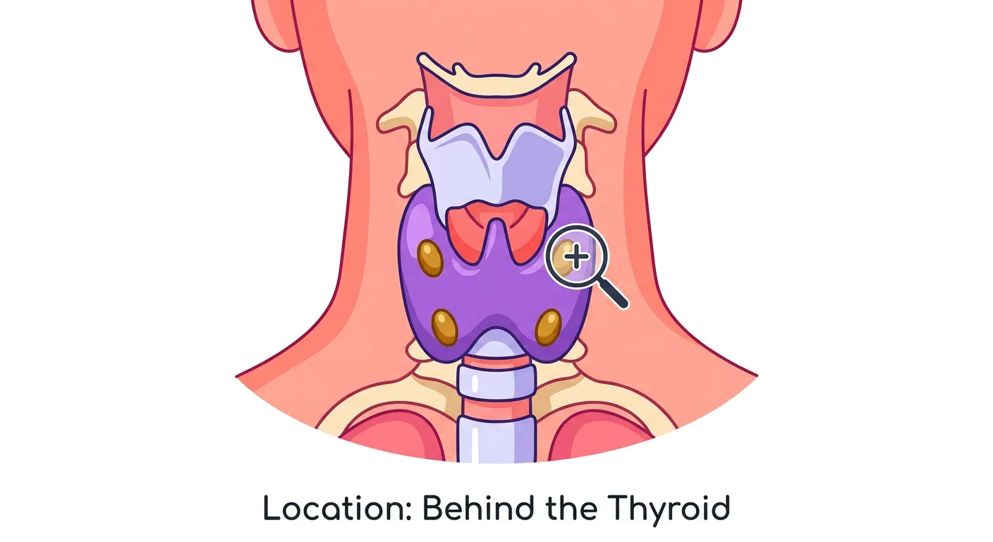 Namaste students! Imagine your thyroid gland is a protective shield in your neck. But hidden right behind this shield, like tiny precious pearls, are four small glands called the parathyroids. These are the unsung heroes of calcium balance. Let's explore their power!