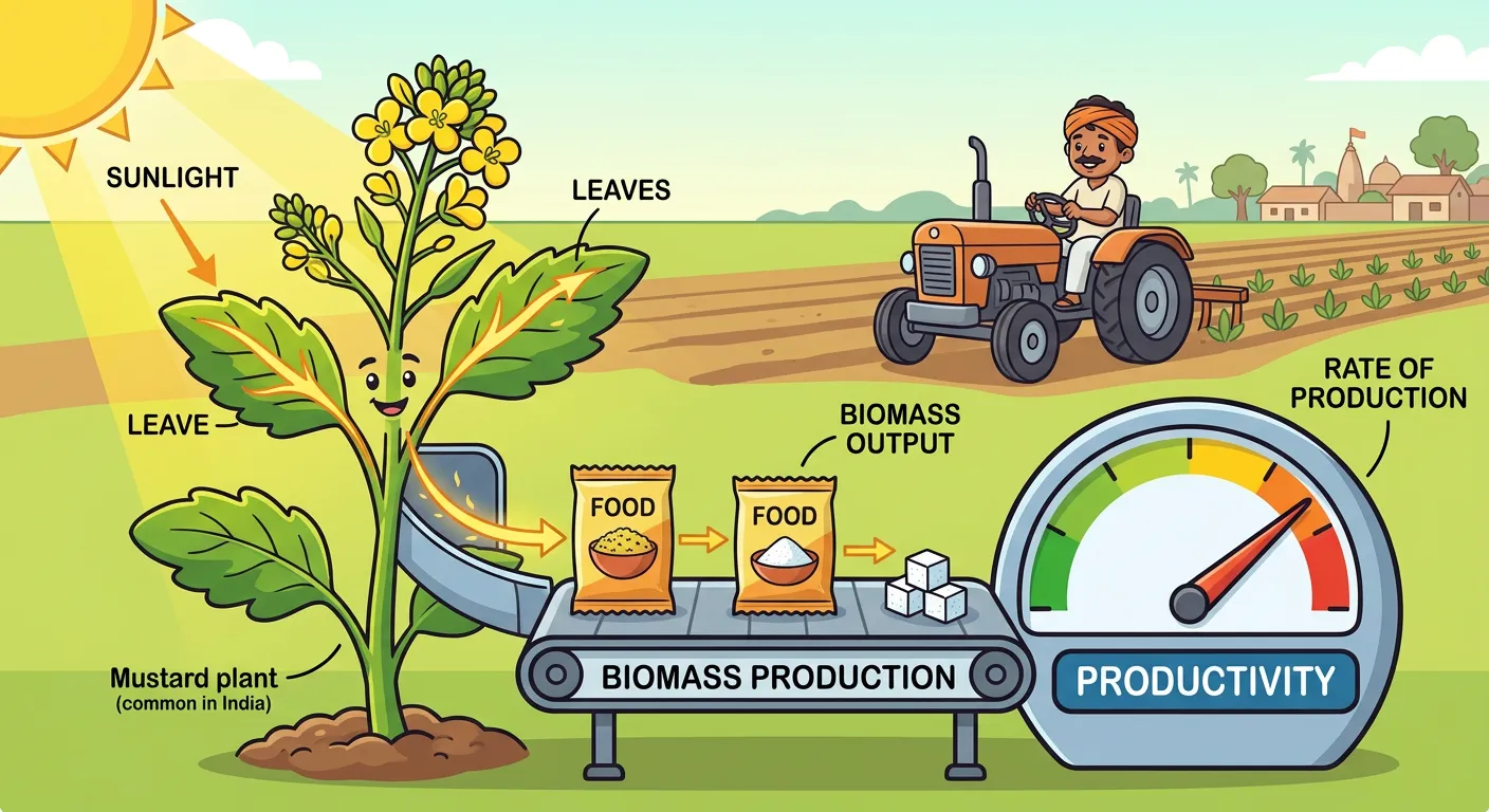Imagine plants as amazing food factories. Just like a factory makes cars per day, plants produce organic matter (biomass) over time. This rate of making new organic material is what we call Productivity. It's the starting point for all life on Earth.