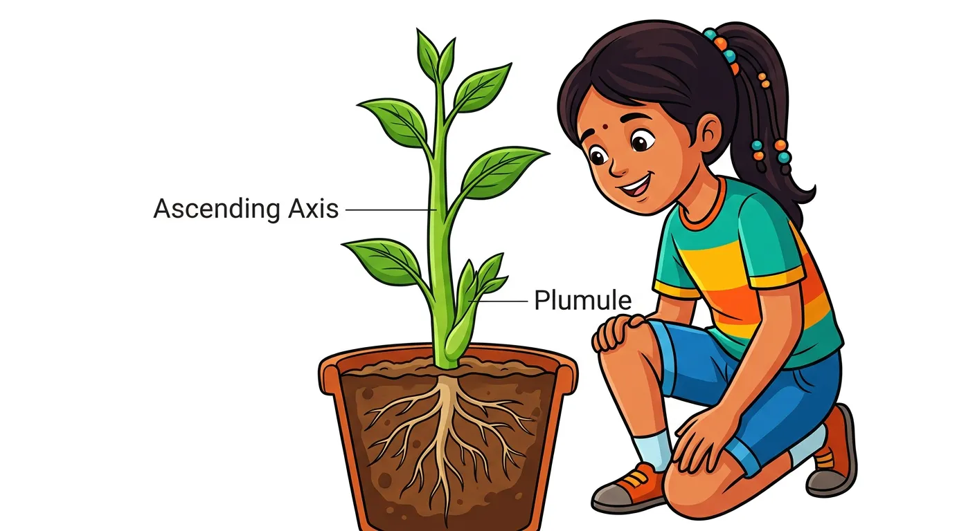 Meet the stem! Think of it as the elevator of the plant. It emerges from the plumule of the embryo, growing upwards towards the sunlight. It is the ascending part of the plant axis, bearing branches, leaves, flowers, and fruits. It is the plant's backbone!