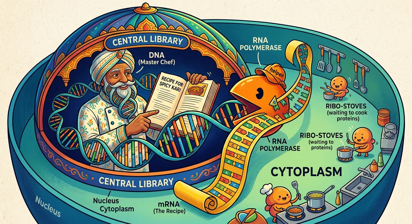 Welcome, future doctors! Imagine your DNA as a master chef's secret recipe book locked in the nucleus. But the kitchen where food is made is in the cytoplasm! Transcription is the process of copying *one specific recipe* from the DNA book onto a temporary note called mRNA. Let's see how this recipe is written!