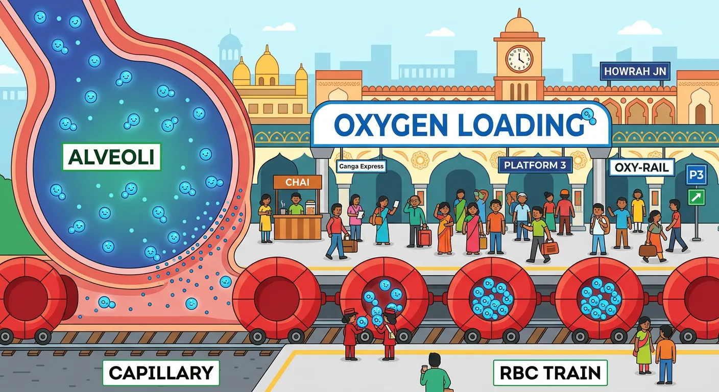Welcome to the transport hub of your body! Just like passengers boarding a metro in Delhi, oxygen molecules hop onto red blood cells at the alveoli in our lungs. This process is all about high-speed transit, moving life-sustaining gas to every single corner of your busy system.