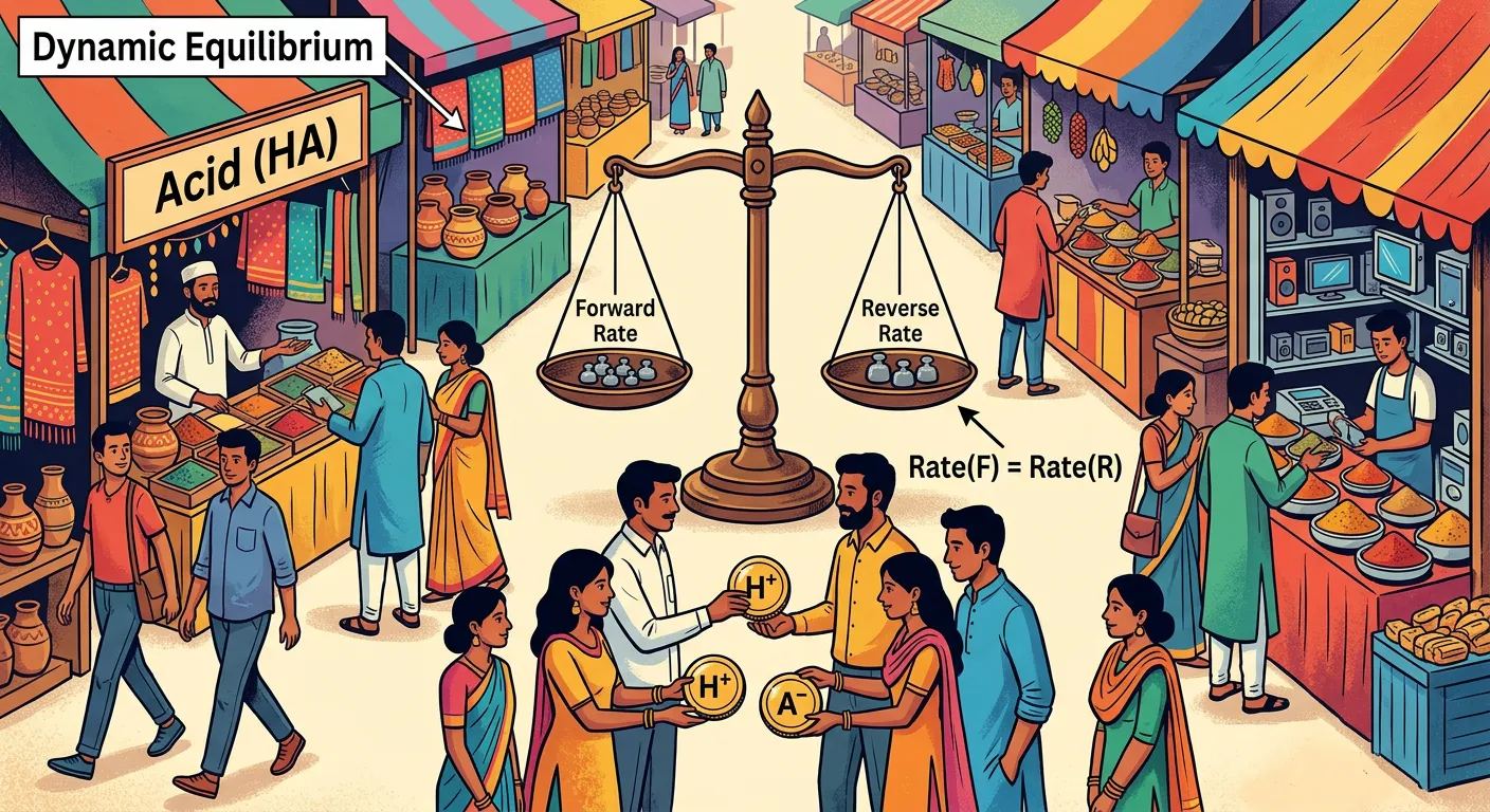 Welcome! Imagine acid-base equilibrium is a busy bazaar, with protons—our $H^+$ coins—being traded. When the rate of protons being sold equals the rate they are bought back, we reach a beautiful, dynamic balance called equilibrium, like a busy but stable market.