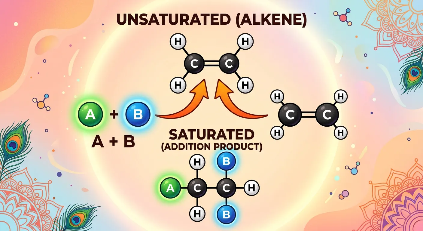 Welcome, future doctors! Imagine addition reactions are like adding delicious toppings to a plain pizza base. We start with an 'unsaturated' molecule, one with a double or triple bond. Then, like magic, other atoms attach across that bond, making it 'saturated' and forming one single, complete product!