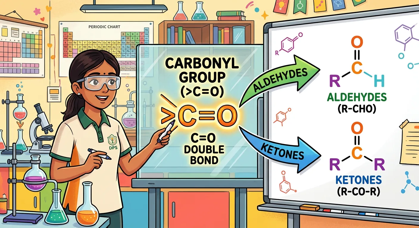 Meet the Carbonyl family—the heart of many organic compounds. Aldehydes and Ketones both share the >C=O group, but they are like cousins with different jobs! Aldehydes have it at the end of the chain, like a main entrance, while Ketones have it in the middle.
