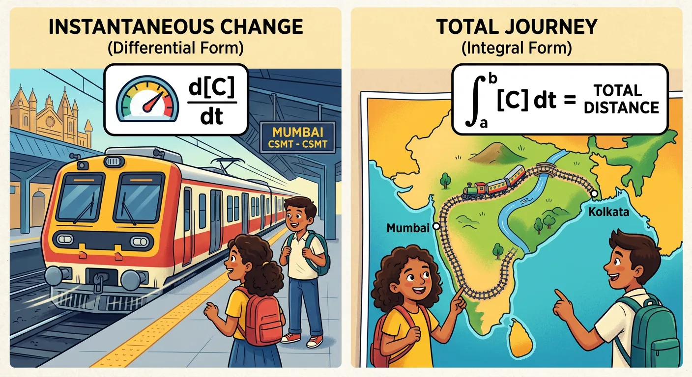 Namaste future doctors! To understand how fast reactions happen, we use two mathematical forms: Differential equations tell us the 'instantaneous speed' at one specific moment. Integral equations, like summing up a journey, give us the 'big picture' over time.