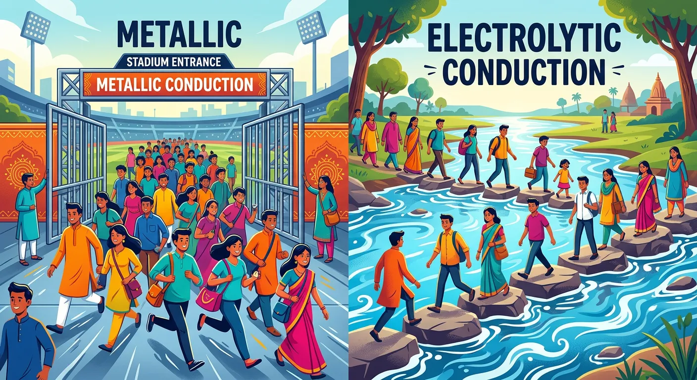 Hey NEET aspirants! Ever wonder how electricity actually moves? Think of it like cricket fans entering a stadium. Today, we'll explore two fascinating ways current flows: like a smooth crowd through gates, and like people stepping across a river. Let's dive in!