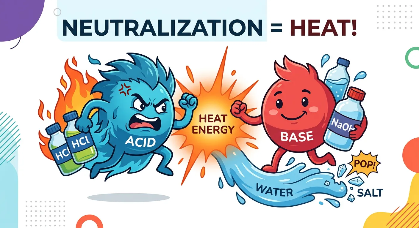 Namaste students! Imagine a powerful clash! In chemistry, when a Strong Acid (like HCl) meets a Strong Base (like NaOH), they fight and neutralize each other. The result? Pure Water, Salt, and a *huge burst of heat energy!* This release of heat is our story today.