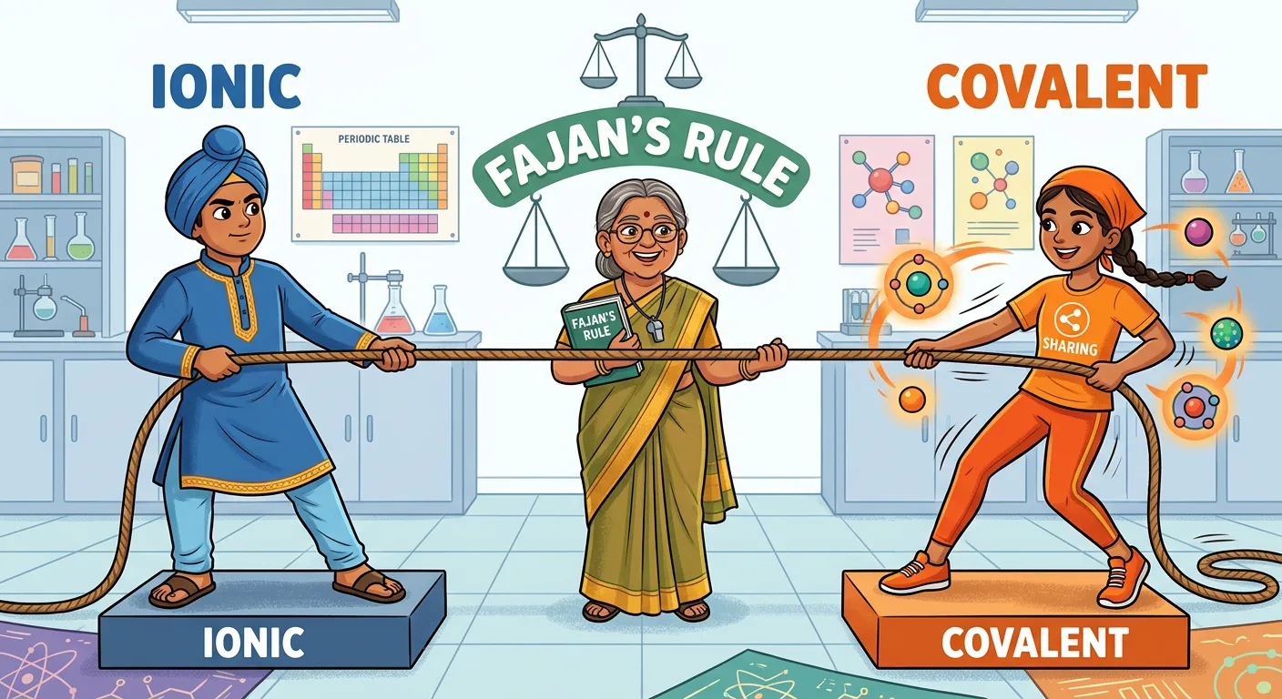 Namaste! Chemistry isn't black and white. Most compounds aren't purely ionic or purely covalent; they are a mix! Imagine a tug-of-war. Fajan’s Rule is like the referee, telling us exactly how much 'covalent flavor' a mostly ionic bond actually has.