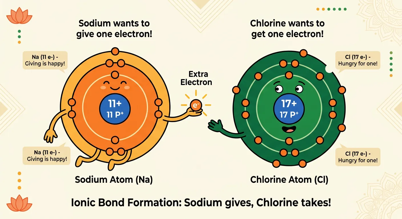 Welcome! Imagine atoms as people looking for stability. Sodium is like a generous donor with one extra electron he wants to get rid of, while Chlorine is like a collector who is desperately searching for one more to complete his shell. Let's see what happens!