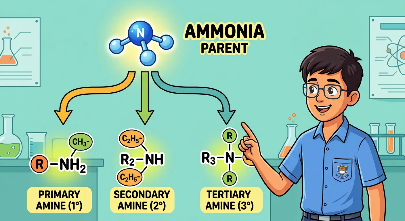 Hello future doctors! Ready to master the identification of Amines? Think of amines as the derivative family of Ammonia (NH3). Just like kids in a family, they look different based on how many 'R' alkyl groups are attached to the Nitrogen atom. Let's find out how to identify them!