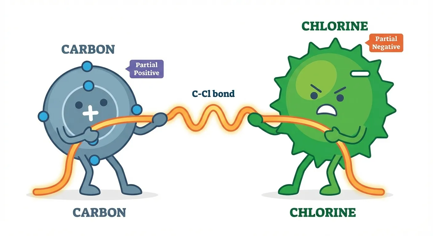 Imagine a friendly tug-of-war. In a C-Cl bond, Chlorine is the stronger player. It pulls the shared electron pair closer, becoming slightly negative. Carbon, losing its grip, becomes slightly positive. This permanent displacement of electrons along a carbon chain is the Inductive Effect!