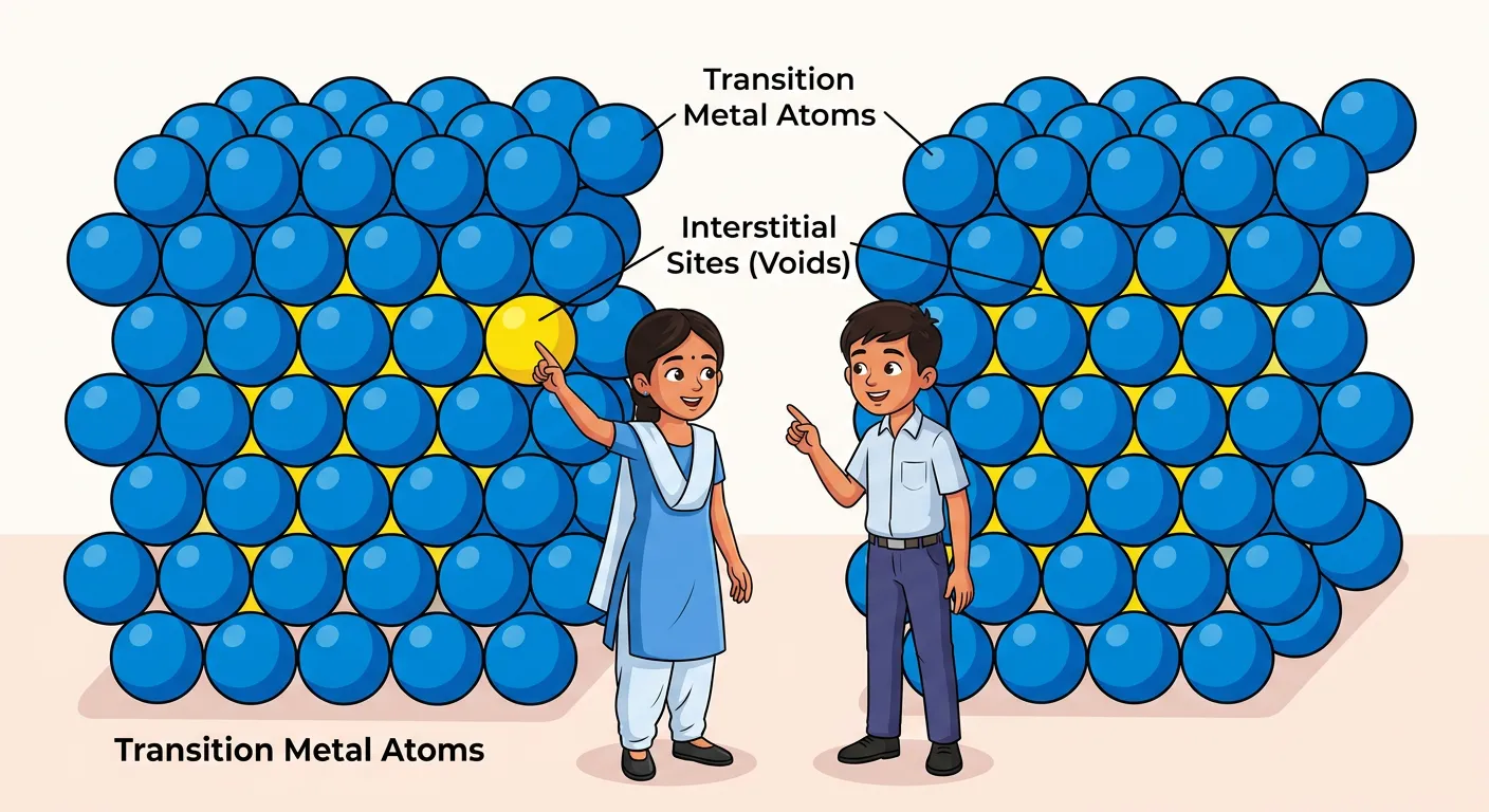 Hello students! Welcome to a journey into the tiny world of metals. Imagine a crowded Mumbai local train, with people tightly packed. See the small gaps between the passengers? In the world of transition metals, these gaps are real, and they're called Interstitial Sites or Voids.