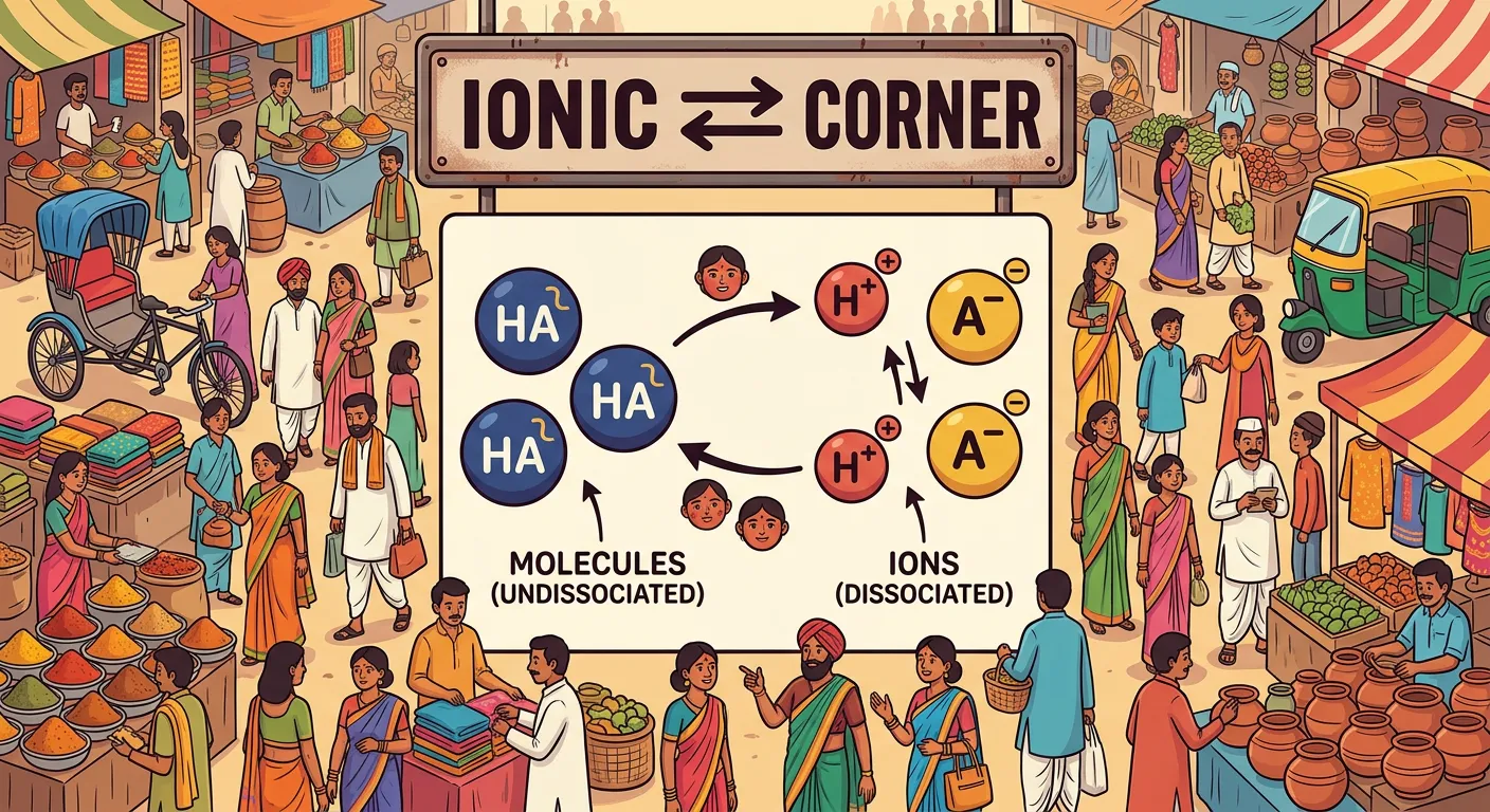 Hello future doctors! Welcome to Ionic Equilibrium. It's like a busy Indian bazaar! People move, buy, and sell, but the total number stays roughly constant. This state of balance, where molecules dissociate into ions and ions recombine into molecules at equal rates, is what we call ionic equilibrium. Let's see how it works!