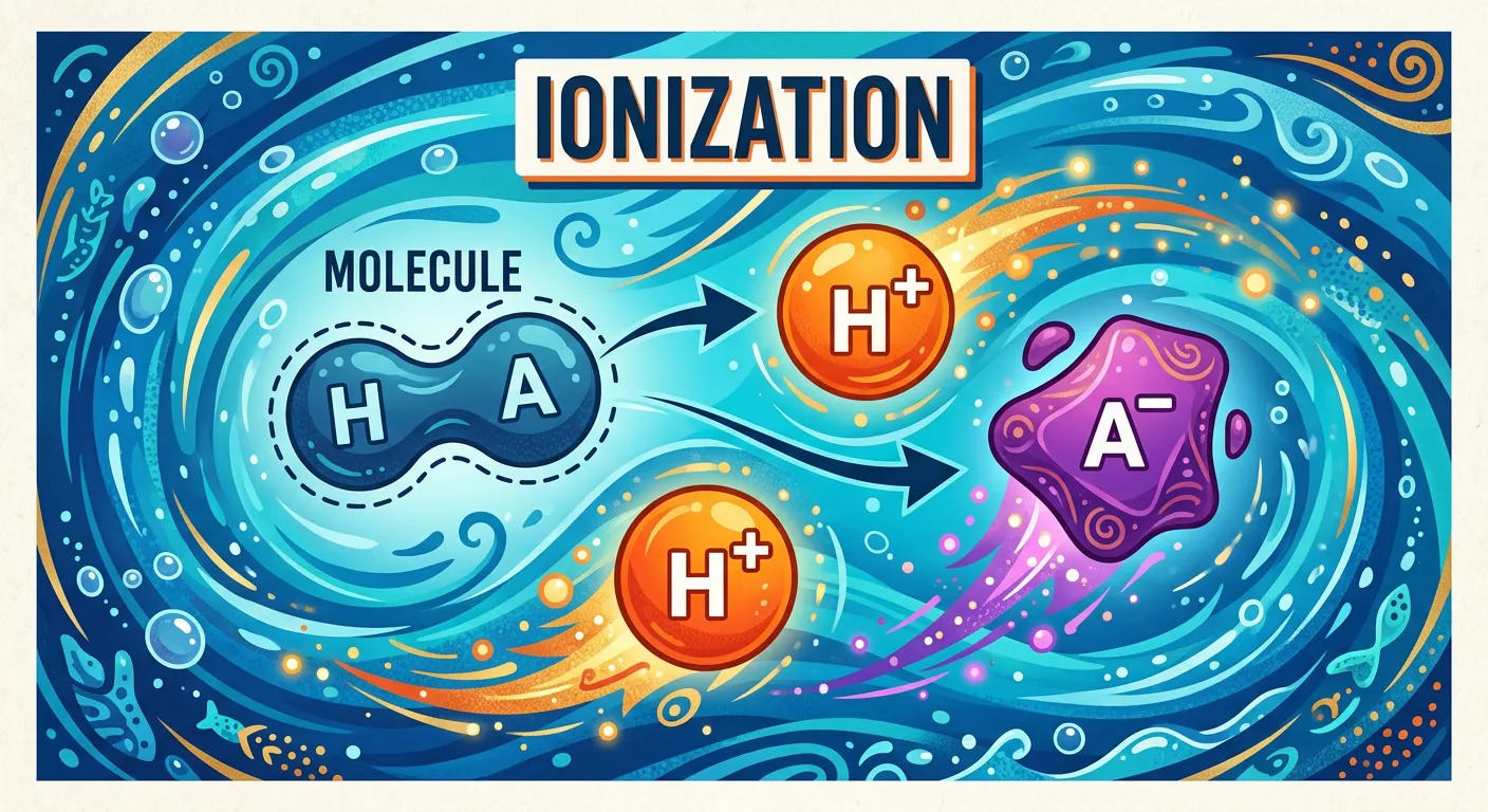 Let's start our Chemistry journey! Ionization is simply the breaking apart of molecules into individual charged particles called ions when they dissolve in a solvent like water. Think of it as a tightly-knit group of friends separating into individual personalities when they go to different colleges.