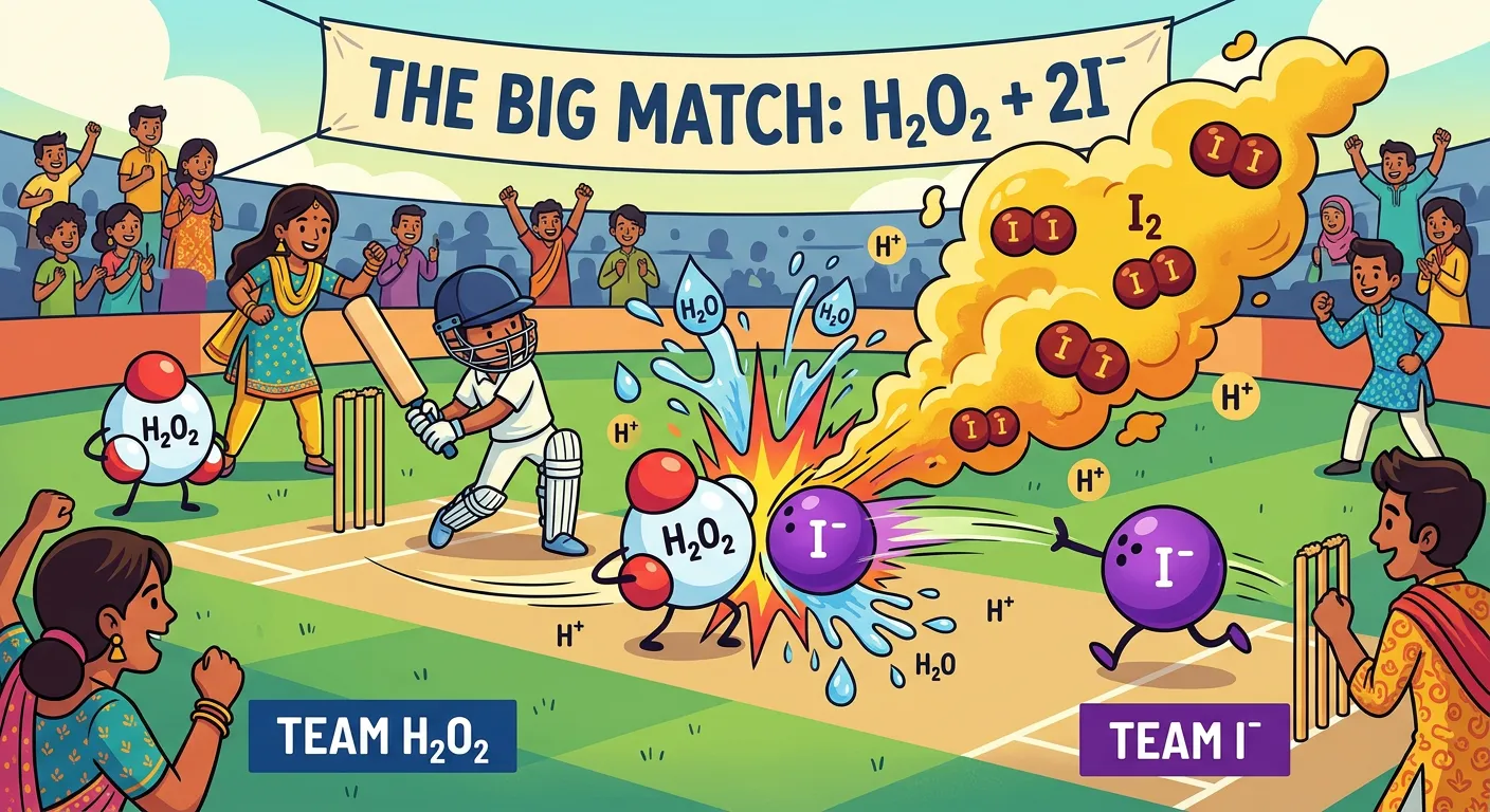 Hello future doctors! Ready to master the 'Big Match' in chemical kinetics? Let's analyze how fast H₂O₂ reacts with Iodide. It's like a cricket game! Who gets out (consumed) and who scores (is formed) and at what speed? That's what kinetic study is all about!