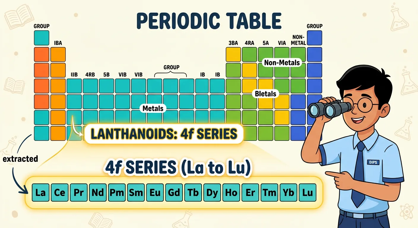 Hello, future doctors! Imagine a special club within the periodic table. Meet the Lanthanoids, 14 elements hidden below the main table, from Lanthanum to Lutetium. Why are they a 'series'? Because they all fill their special '4f' orbital. Let's explore their unique world!