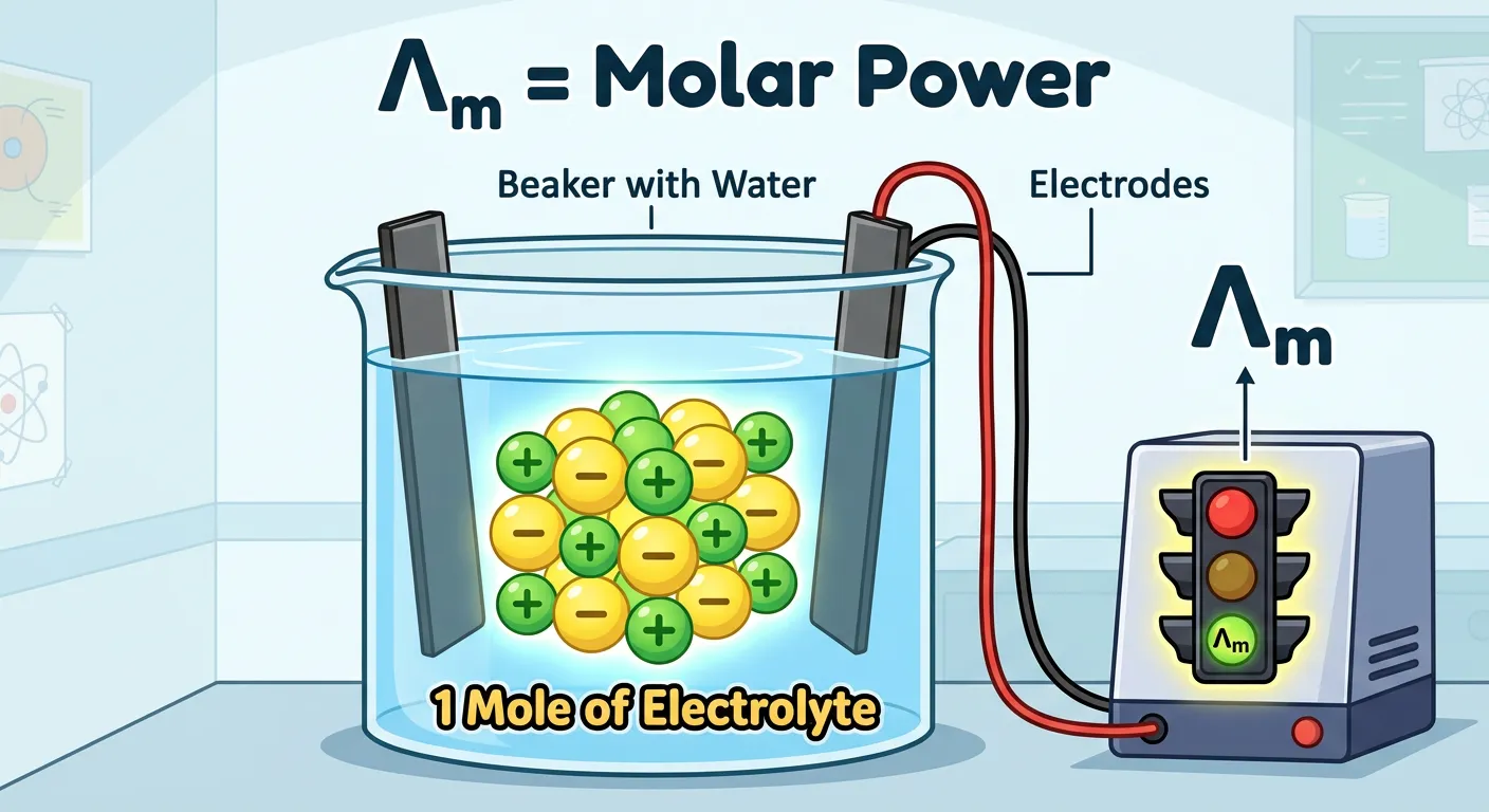 Hello future doctors! Today, we'll master Molar Conductivity (Λm). Imagine you have a special group of 'supercharged runners' representing exactly one mole of an electrolyte. Λm measures the collective 'running power' of this specific 1-mole group in a solution. Let's see how this power changes!