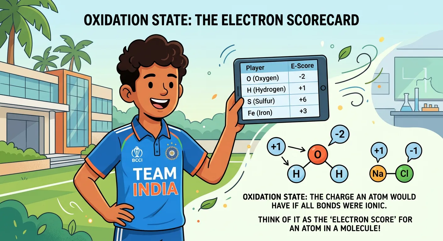 Think of an atom in a molecule as a player on a cricket field. The Oxidation State is like keeping score – it’s a hypothetical charge we assign to track which atom is holding the 'ball' (the electrons)! A higher score means it's gained control; a lower score means it's lost it.