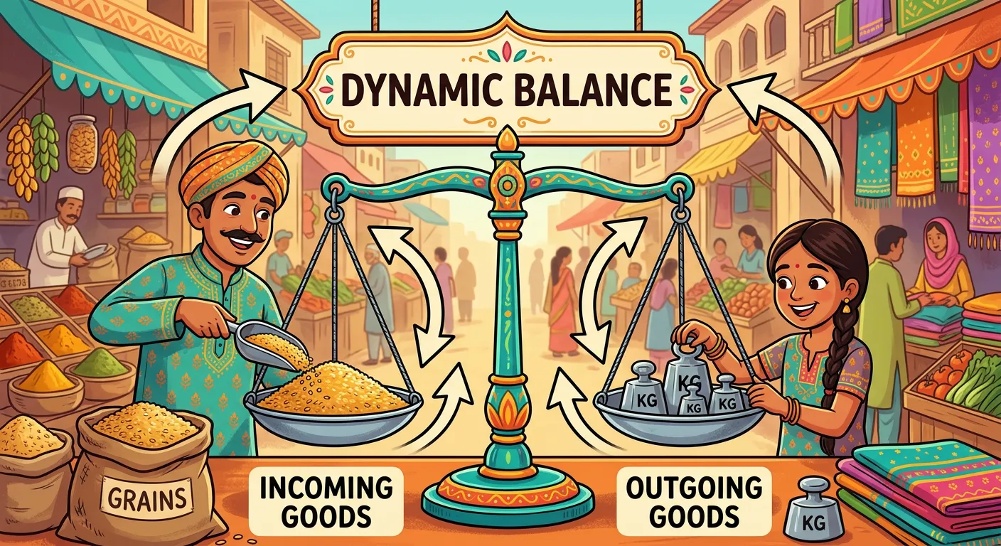 Welcome! Imagine a busy bazaar. Customers add grains to a scale, while the shopkeeper adds weights. It looks still, but there's constant activity. This is 'dynamic equilibrium' in a physical process. Both forward and reverse changes are happening at the same rate!