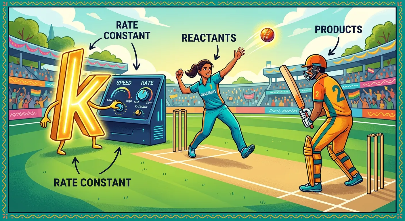 Imagine a cricket match! The speed at which runs are scored (the Rate) depends on the skill of the batsmen (concentration). But there's a unique quality to the pitch and the bowler that 'sets' the maximum achievable speed. That innate quality, unique to every reaction, is the Rate Constant, 'k'!