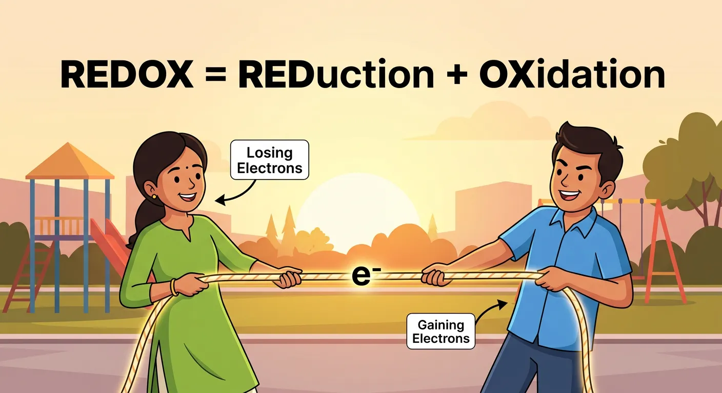 Welcome, future doctors! Today, we unlock the secrets behind rusting, batteries, and burning fuel. It’s called Redox. Just like a friendly tug-of-war for electrons, Redox is simply a game of 'Reduction' and 'Oxidation' happening simultaneously. Let's find out who's pulling the electrons!