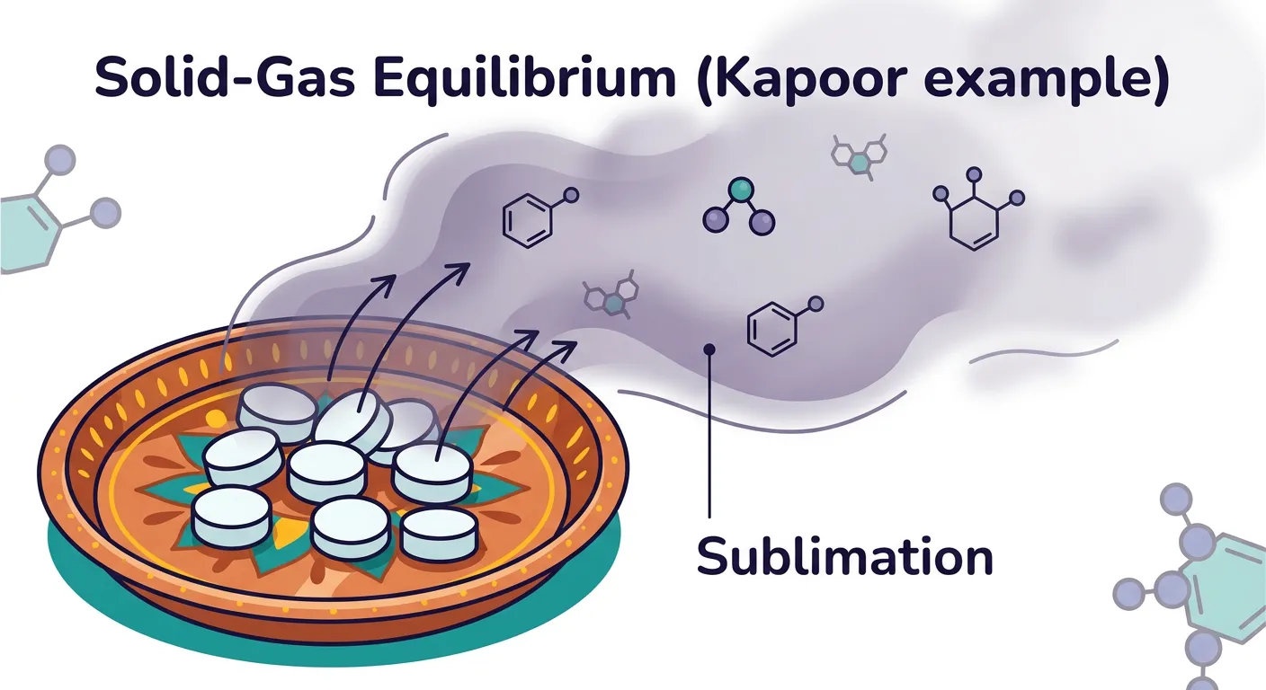 Imagine you're doing a puja. When you burn camphor, it *disappears* without melting into a liquid, right? In chemistry, this direct jump from solid to gas (and back!) is called 'Sublimation.' When the rate of sublimation equals the rate of condensation, it's called Solid-Gas Equilibrium!