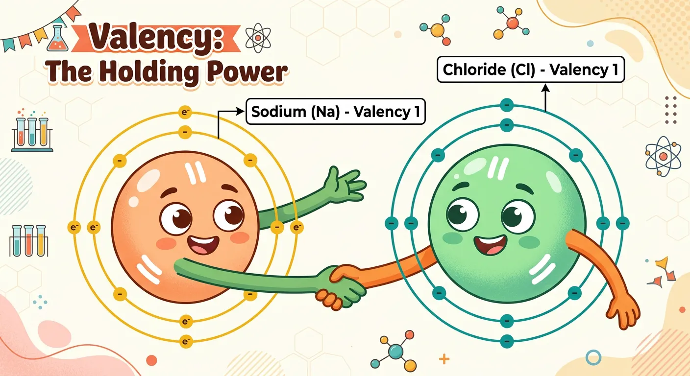 What is valency? Imagine a bustling Indian bazaar where everyone is trying to hold hands and form chains! Some people have one hand free, others two. That's valency – the specific 'holding power' or combining capacity an atom has to form molecules with other atoms.