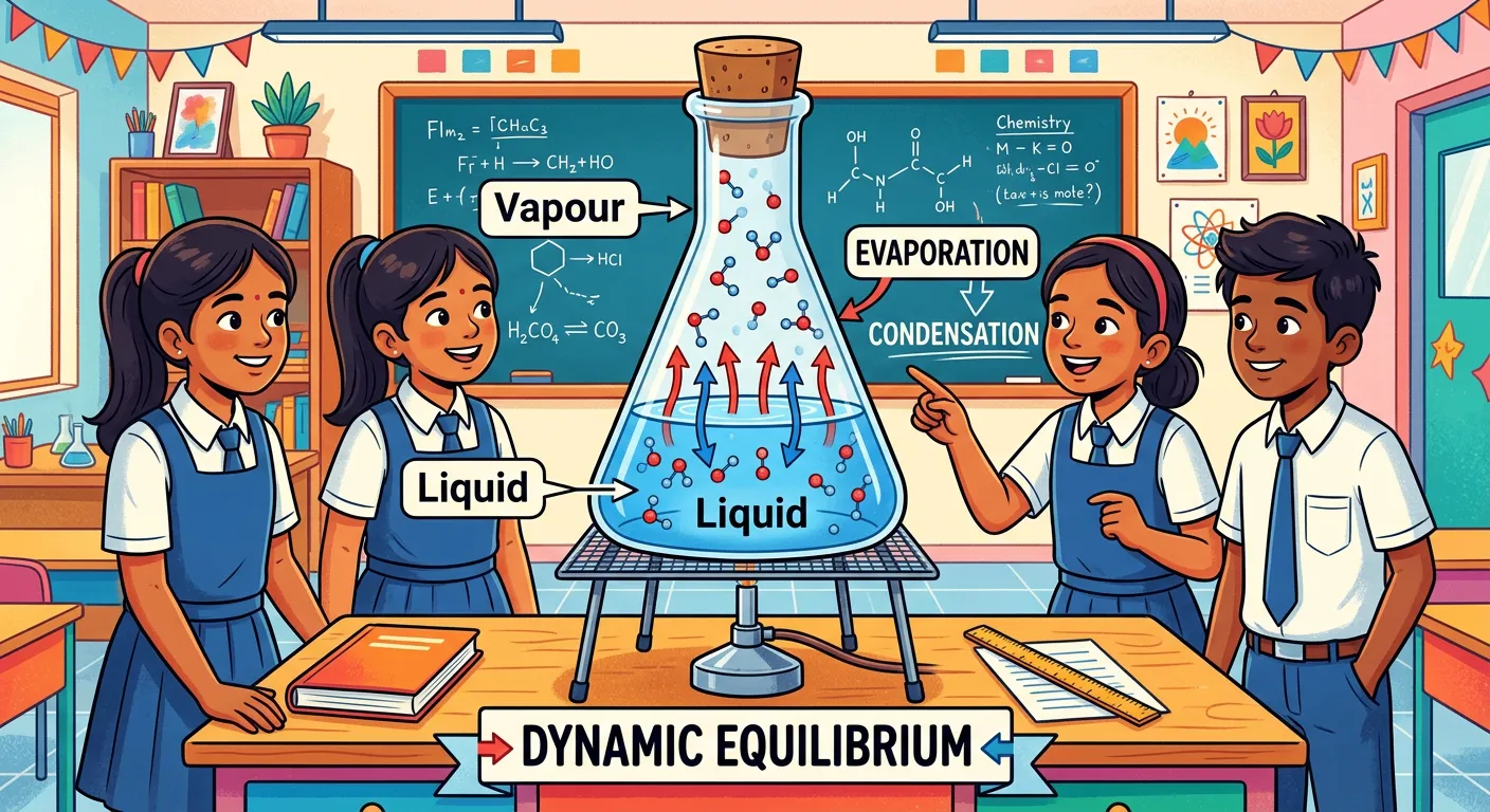 Hello future doctors! Imagine a closed container. Some liquid molecules are escaping into the air, and some are coming back. When the rate of escaping equals the rate of returning, they are in dynamic equilibrium. This creates vapour pressure.