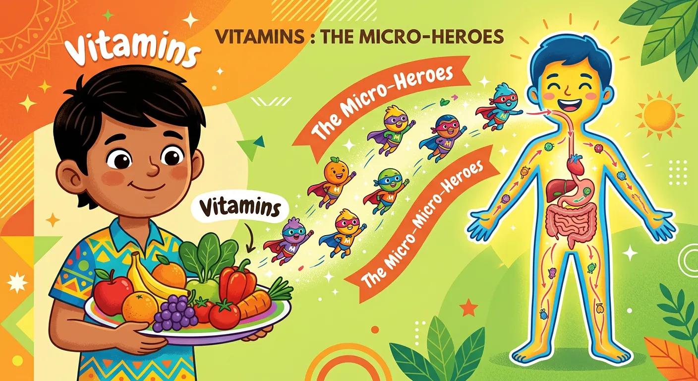 Hello future doctors! Think of your body as a busy city. To keep everything running smoothly, it needs tiny but powerful 'Micro-Heroes' called Vitamins. They aren't fuel, but they are absolutely vital for almost every single metabolic reaction.