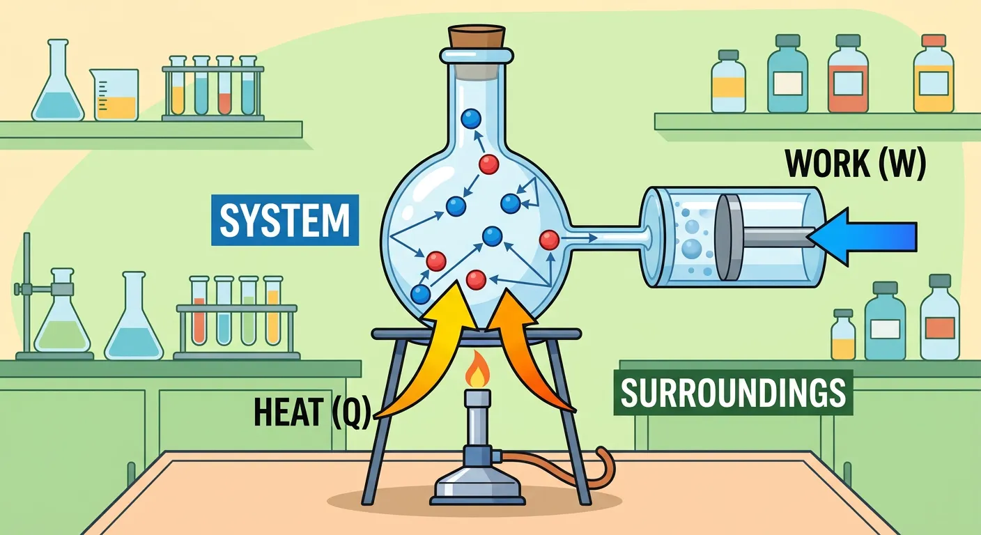 Welcome, future doctors! Today, we dive into Thermodynamics. It's simply about how energy is exchanged between our 'System' (the reaction we are studying) and its 'Surroundings' (everything else). Let's unlock the secrets of Heat, Work, and Internal Energy!