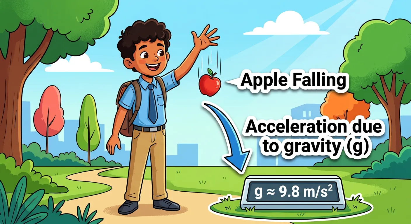 Hello future doctors! Ever wondered why a mango always falls *down*? That's gravity! 'g' is the acceleration gravity produces. It doesn't care if it's an apple or a elephant; everything accelerates at around 9.8 m/s² towards Earth's center. Let's explore!