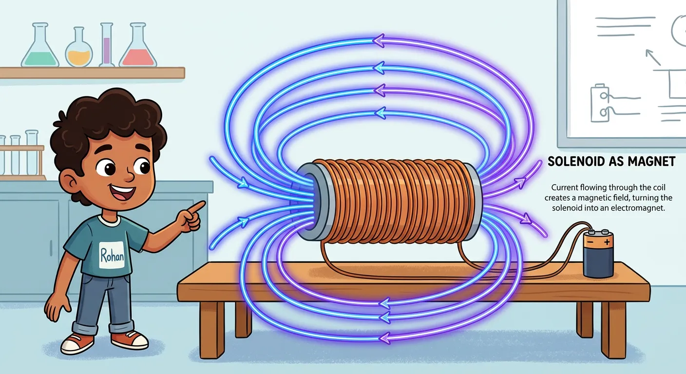 Ever wondered if a coil of wire could act just like a magnet? Current is the 'magic energy' here! When current flows through this solenoid, it creates its own magnetic force field. Let's see how this makes it a 'super-sized' bar magnet.