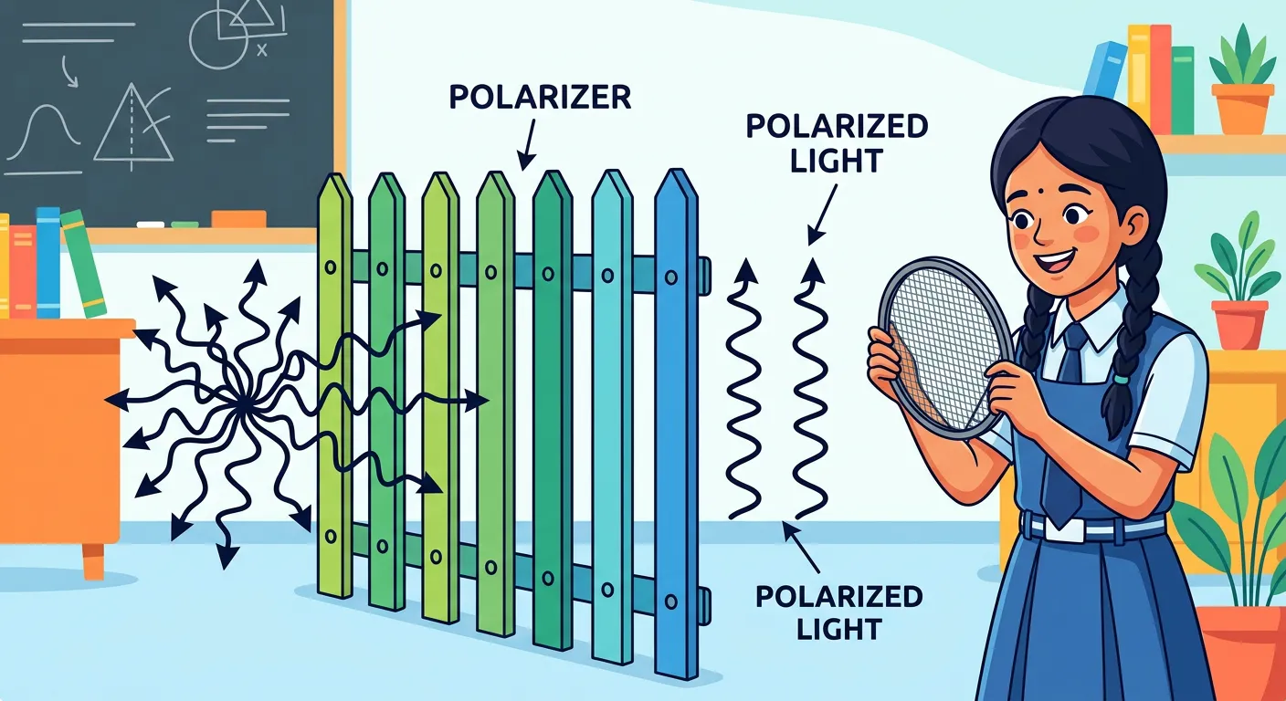 Imagine light is like chaotic, jumping waves vibrating in all directions. Polarization is like putting a magic 'sieve' or a picket fence in front. It only lets the waves vibrating in one neat direction pass through! This ordered light is 'Plane-Polarized Light'.