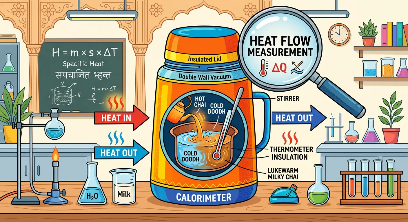 Hello future doctors! Today, we enter the world of Calorimetry. It sounds complex, but it’s simply measuring the heat energy moving around. Think of it as finding out exactly how much 'hotness' passes from hot chai to cold milk until they reach the same, cozy temperature. It’s a guaranteed NEET topic!