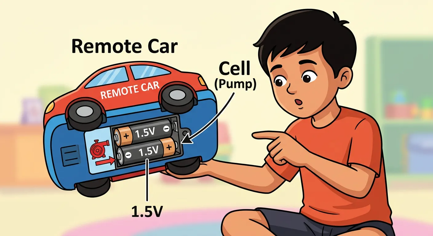 Hello students! To power things like this remote car, we use cells. Think of a cell as a simple *electric pump* that pushes current around a circuit. It has an EMF (voltage) and a little internal resistance.