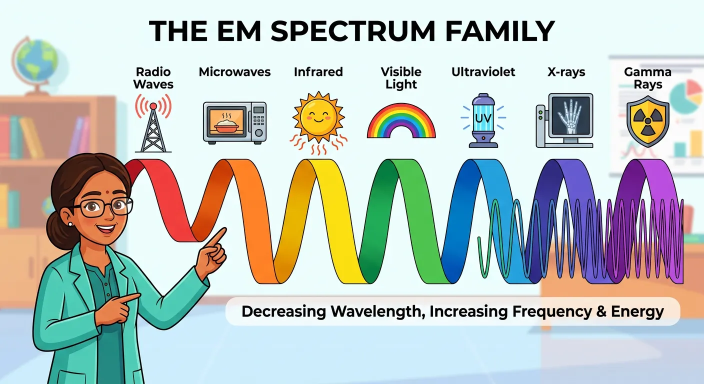 Hello future doctors! Welcome to the grand family portrait of Electromagnetic Waves. Just like your family has different members, from calm elders to energetic kids, the EM spectrum has waves ranging from low energy to high energy, but all traveling at the same speed – the speed of light!