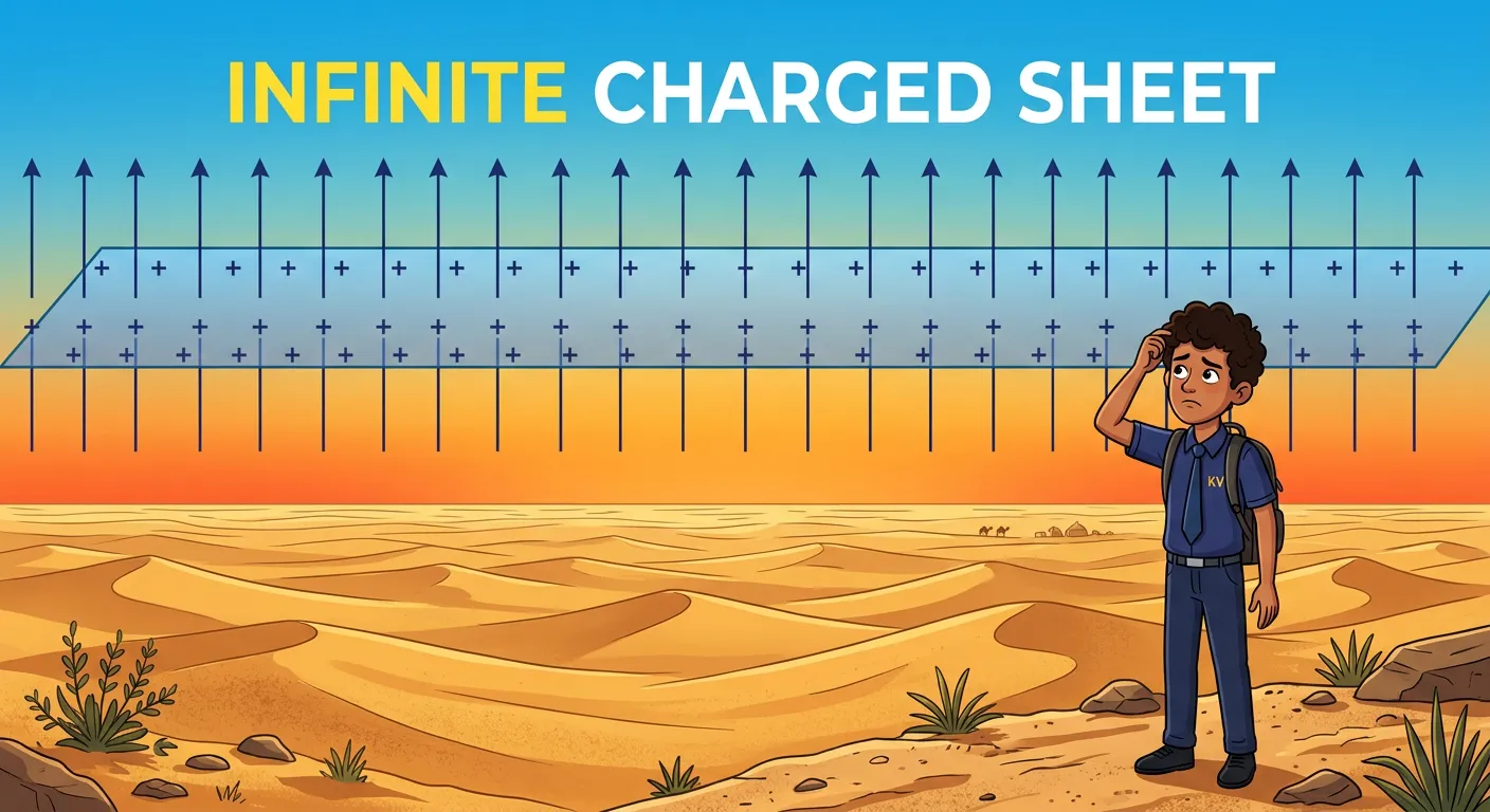 Meet Rohan! He’s looking at this massive, infinite plane sheet covered in positive charge. How on earth do we find the Electric Field ($E$) created by something so impossibly large? That's our mission today. Let's find the answer near this vast surface.