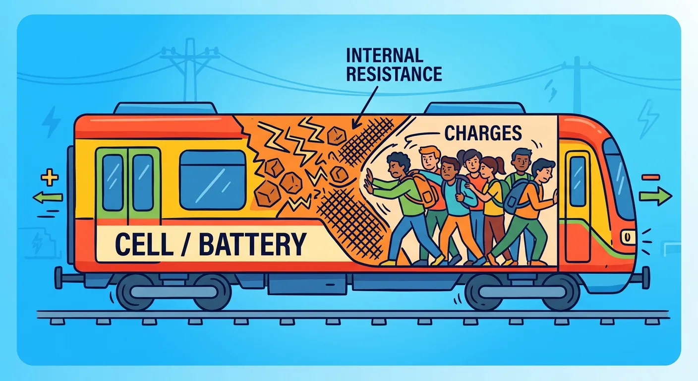Think of a cell like a crowded Delhi Metro train! While the cell provides the energy (like the train's power), the 'Internal Resistance' is like the thick crowd inside. It makes it hard for charges (the passengers) to move, affecting how much 'push' they get!