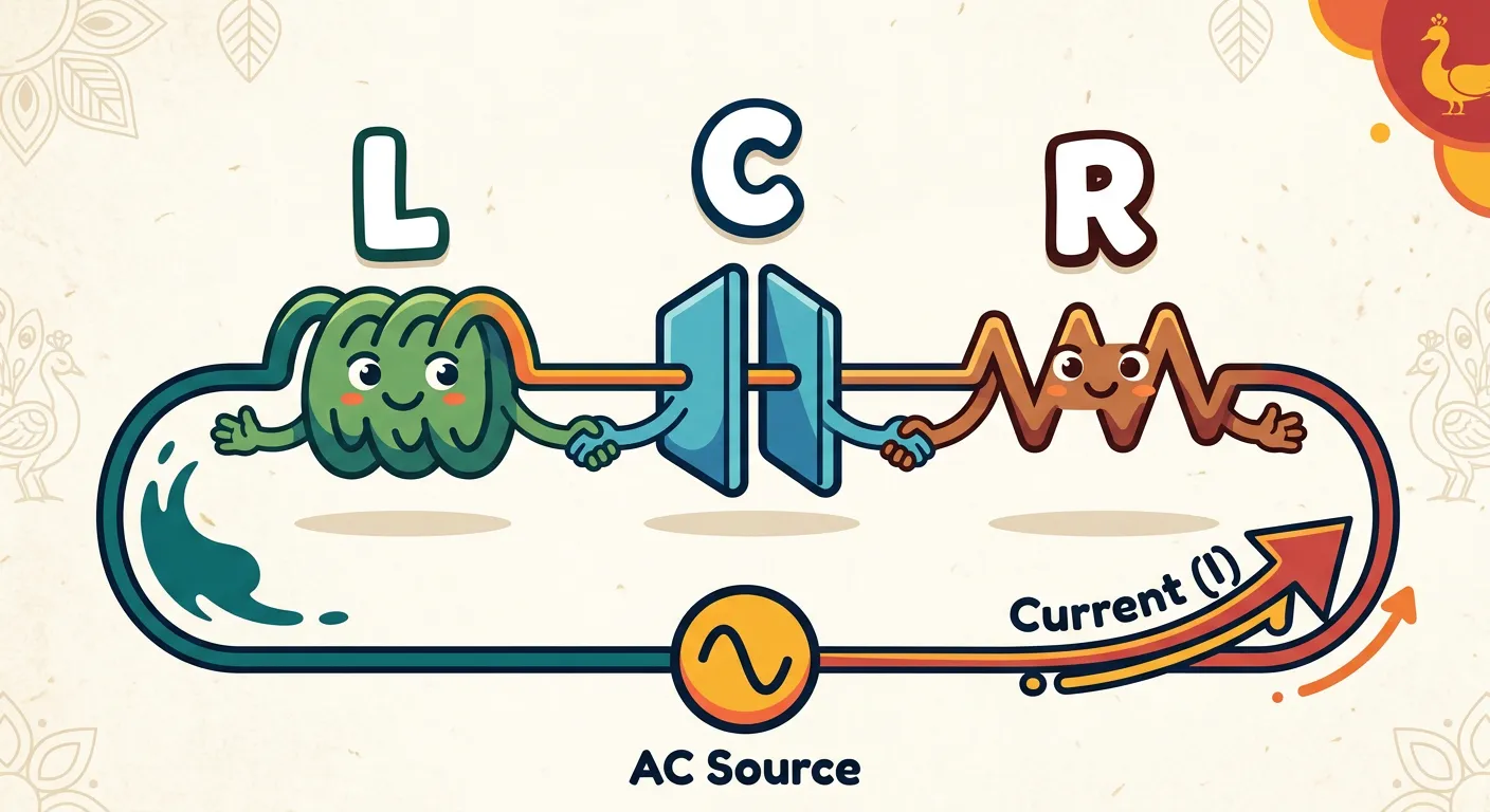 Meet the dynamic trio of electronics! Inductor (L), Capacitor (C), and Resistor (R). Today, they join forces, connecting end-to-end to form the LCR Series Circuit. Think of them as team players on a single track, facing the AC voltage source together.