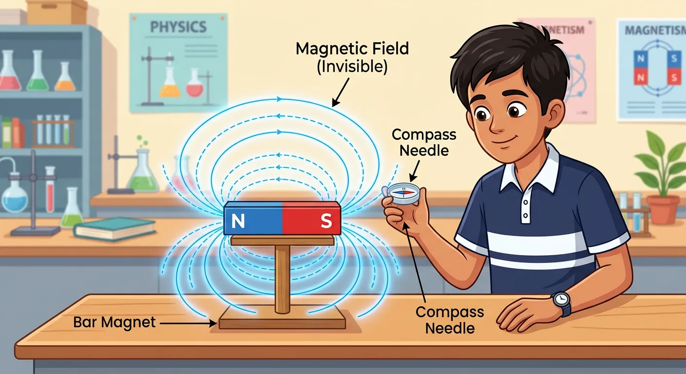 Imagine an invisible 'aura' of force surrounding every magnet. This aura is the 'Magnetic Field'. It's like an unseen map of influence that tells other magnetic materials, like a compass needle, exactly how to behave. Since we can't see it, we need a clever way to map it.
