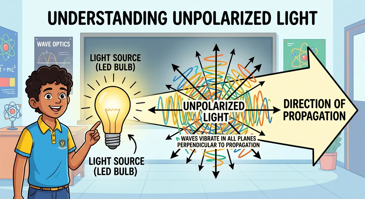 Imagine light like a wavy rope. It can vibrate up-down, left-right, or diagonally – everywhere, really! This messy, all-directions vibration is what we call 'unpolarized' light. In this lesson, we'll learn how to tidy it up!