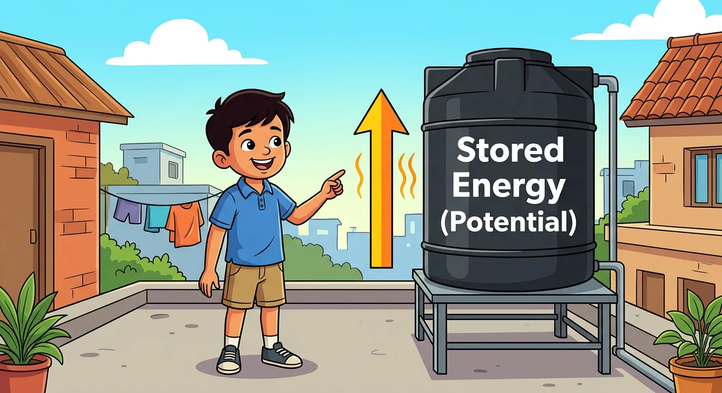 Imagine carrying water up to your rooftop 'tanchi.' That effort isn't lost; it's stored! This is 'Potential Energy.' Think of it as energy 'hidden' or parked because of an object's position, ready to do work later. Let's see how!